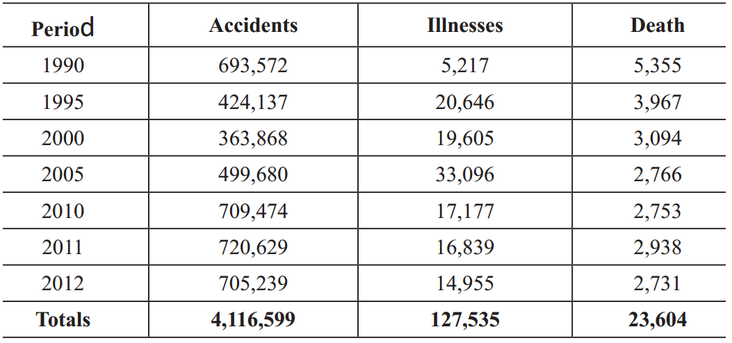 At the global level, according to the International Labor Organization (ILO), on the basis of the information available for 2015, there were 6,300 work-related deaths per day, and 317 million workers were victims of accidents every day, which is equivalent to 850,000 daily injuries, with four days or more of leave. This includes “accidents” involving serious intoxication with pesticides, resulting from hydro-agricultural business activities. In Brazil, according to Rodrigues (2012), more than 400,000 cases of pesticide contamination are reported, however, unlike acute contamination, the diagnosis of chronic contamination is cumulative and symptoms may delay in appearing, as a rule being confused with common diseases and are not notified. According to a study by the Central Única dos Trabalhadores (CUT) (Apud REDE BRASIL ATUAL, 09/05/2014), in the last 42 years, 38 million work-related accidents have occurred in Brazil, of which 560,000 victims are identified as permanently incapacitated. Despite the fact that in the last two decades, the number of deaths at work has been decreasing gradually, the number of occupational accidents and illnesses (Table 1) has increased, in an expressive and worrying way, with the country occupying the shameful fourth place on a global level.