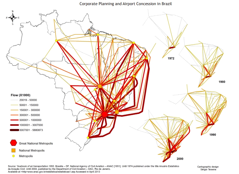 Air traffic data on the air transportation system, provided by the Department of Civil Aviation (DAC) each year, with details on each airport managed by INFRAERO, make it possible to organize flow maps of the whole territory and intercross these with the network of cities. These databases help to reveal the importance of fixed airports for the organization of territorial planning, the main flows anchored in the analysis of the urban network, and also reveal the importance of the transportation system for the analysis of the city network, making it possible to compare the historical series and airport interconnection capacities and assess trends.
