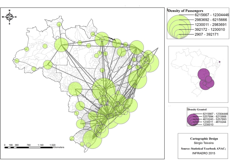 The survey done for this study shows that the airport concessions extend though the whole territory. It can be observed in map 2 that of the 879 pairs of origin-destination connections of the transportation system’s network of flows, which carry a total of 72 million passengers, 67 pairs of connections refer to São Paulo - SP transporting 32 million passengers; 56 pairs of connections referring to Rio de Janeiro-RJ carrying 11 million passengers; 52 pairs of connections referring to Belo Horizonte - MG that carry 2.5 million passengers; 50 pairs of connections referring to Brasília - DF that carry 9.4 million passengers; 26 pairs of connections referring to Campinas - SP that carry 1.2 million passengers and 14 pairs of connections referring to Natal - RN that carry 60 thousand passengers. Therefore, there are about 57 million passengers originating from granted airports, that is, about 80% of the passengers transported.