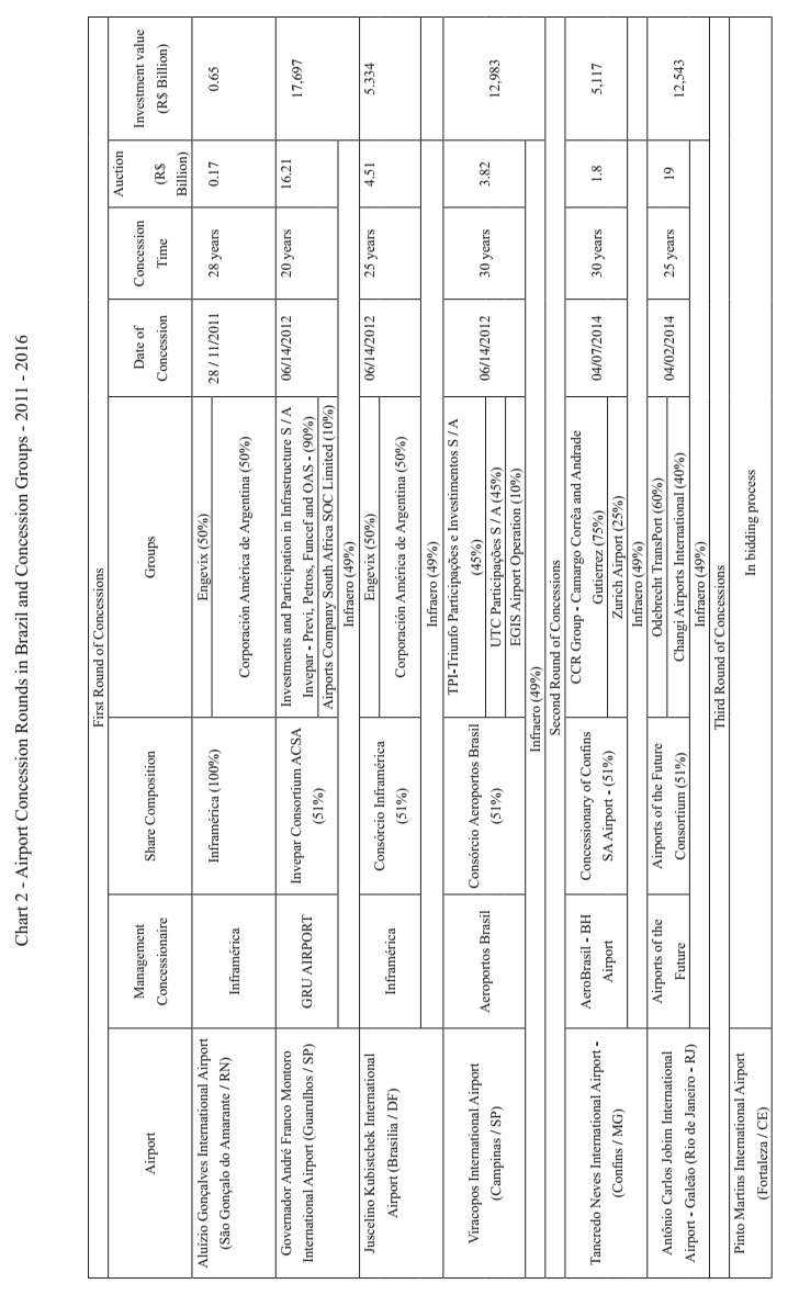 These numbers draw attention, first because the investments were projected from an increase in the flow that might not take place. However, this was one of the criteria to decide on the group that would win the concession of the airports in question. Secondly, contradictorily, the amount paid for the concession also depended on the income destined for the flows of passengers and might not be paid if that flow was not confirmed. This was what was foreseen in the edicts of the concessions, since the amounts described herein were paid in installments, at low interest rates financed by the BNDES, depending on the demand for profits generated at the airports: “The value of the Concession will be paid in annual installments, as of the date and effectiveness of the concession contract until the advent of its term “ (ANAC, 2011, p. 27).