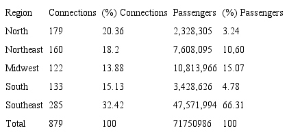 Regarding the regional issue, figure 1 indicates the continuity of the concentration patterns in the southeast region and in the concentrated region. The southeast region has 1/3 of all connections in the network of flows and transports 66.3% of all passengers of the main lines of flows. The central-west region confirms its recent dynamism associated with the expansion of the agricultural frontier and with the public administration center installed in Brasília - DF, transporting 15.07% of all passengers in the network. The city’s Juscelino Kubistchek international airport is the node of the Center-west region, becoming the North’s territorial interconnection hub with the Southeast region. The Northern and Northeastern regions appear as the rarefied regions of the territory, because although they concentrate almost 40% of the connections, they only carry 14% of the passengers. The complex formed by the concentrated region has a dense, highly fluid interconnection, offering a greater interconnection capacity in the territory (figure 2)