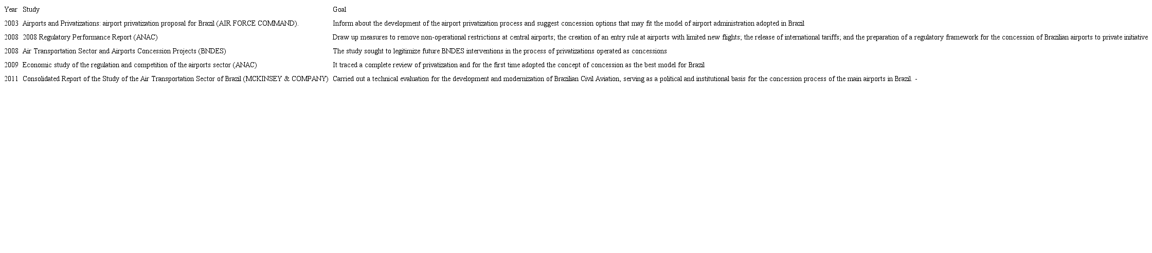 In 2008, the study “Projects of the Air transportation sector and Airport Concession”; was carried out the BNDES team, this study sought to legitimize future interventions by the bank in the airport concession process. In 2009, CONAC - the Civil Aviation Council was created; an advisory body for the president responsible for proposing a national civil aviation policy. This council had the role of forwarding the concession proposals to the presidency. In the same year, through the Project BRA / 01/801 - ICAO - ANAC, the “Economic Study on the regulation and competition of the airport sector” was commissioned by ANAC. The study, which was denser than the previous ones, organized a complete review of privatization and for the first time adopted the concept of concession as the best model for Brazil. A chart showing studies that indicate the process of transferring the sector to the corporations follows below.