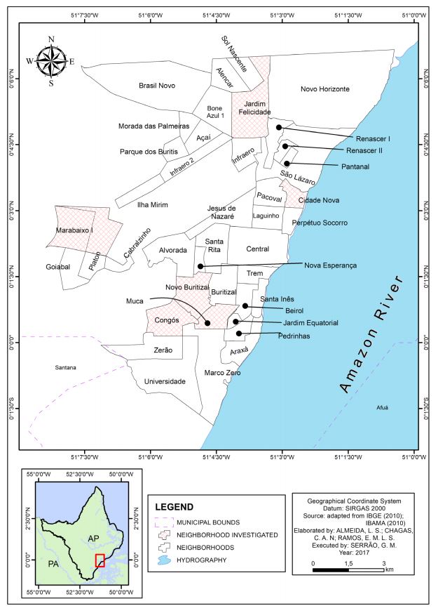 Macapá, capital of Amapá, is located in the extreme north of the country and is bordered by the state of Pará. According to data released in the 2010 Demographic Census, the total population comprises 398,204 inhabitants, the population estimate for the year 2016 is around 465,495 inhabitants (IBGE, 2010a, 2016).