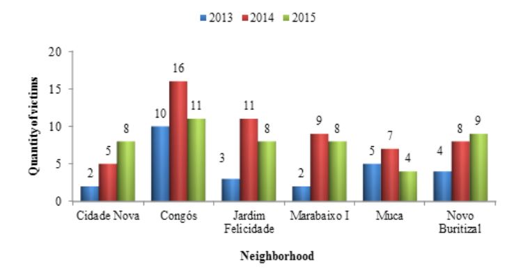 It can be seen in Figure 2 that the Congós neighborhood leads the number of victims of lethal violent crime in the time series analyzed. In 2014, the neighborhoods of Jardim Felicidade, Marabaixo I and Novo Buritizal stand out, with 11, 9 and 8 victims respectively. Regarding the years 2013 and 2015, it is evident that the number of victims in the Novo Buritizal neighborhood more than doubles and triples in Marabaixo I. In the Muca neighborhood there is an increase in the number of victims, from 5 in 2013 to 7 in 2014, followed by a subtle decrease in 2015.