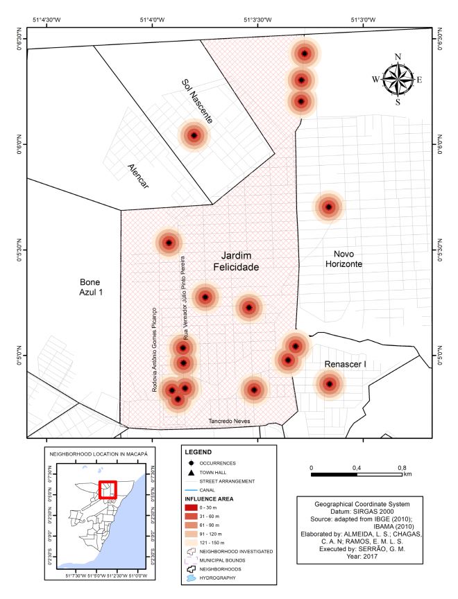 Jardim Felicidade is one of the oldest neighborhoods in the north of the city, with a population of 16,672 inhabitants and 3,898 permanent private households, distributed over a total area of 2.6 km² (IBGE, 2010b). It is important to point out that the expansion caused by urban pressure in Macapá occurred in all directions, but especially in the northern part of the city, increasing the problems faced by the population of this region of the city, which is behind in terms of infrastructure and urban equipment, such as the lack of basic sanitation, problems with the water and electricity supply, unpaved roads, and deficiencies in transportation and public services. This administrative unit has a significant amount of housing in ressaca areas, not as densely populated as the neighborhoods of the southern area of the capital, but which has similarly been suffering from the progressive increase of the “landfill campaign” for ressaca areas, a peculiar phenomenon important in the dimension of informal housing in the capital of Amapá (TOSTES, 2006; TOSTES; LUZ, 2014). These spaces are fragmented expansions of the urban territory, neglected by the public authorities, with characteristics that exclude citizenship, which favored the weakening of the ties of social control mechanisms and the installation of violence and crime in these spaces (GOMES, 2005; BEATO FILHO, 2012).