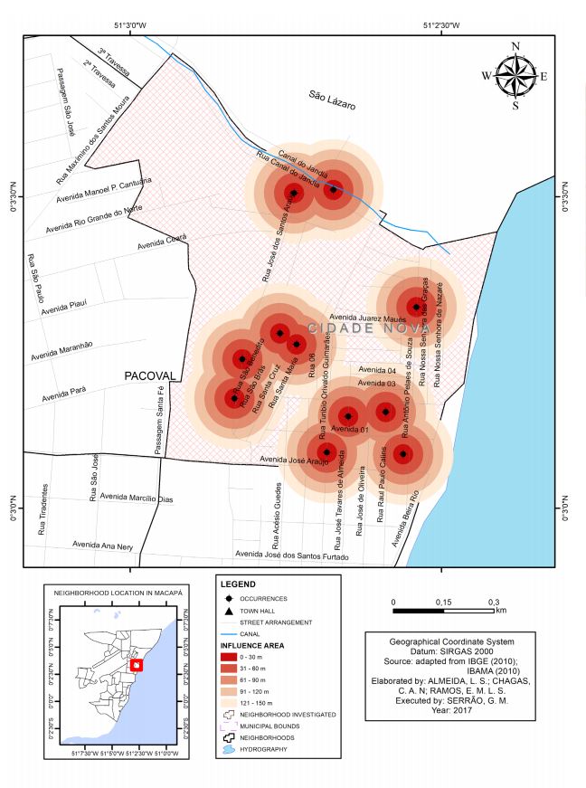 The Cidade Nova neighborhood has a population that exceeds 15 thousand inhabitants, with 3,211 permanent private households, distributed in a total area of 0.8 km² (IBGE, 2010b). It is located in the eastern part of the capital, in the area of the city bordering the Amazon River, where there are numerous irregular dwellings in flooded areas, with irregular connections to the electricity grid, without water and sewage infrastructure, without road paving and regular garbage collection and whose characteristics coincide with those of the exclusion area. Although the neighborhood is located in the most central part of the capital, its reality contrasts sharply with the properly subdivided, urbanized area, which has most of the main urban services in Macapá. In addition, although the Cidade Nova neighborhood is a geographically small space, it has a high flow of people, due to its commercial importance and proximity to the city center. Cidade Nova, along with the neighborhoods of Jesus de Nazaré, Pacoval and São Lázaro is located in the extension of the Jandiá Channel, where a small port area serves as an outlet for wood products (CARDOSO et al., 2015).