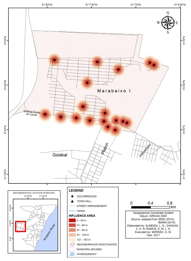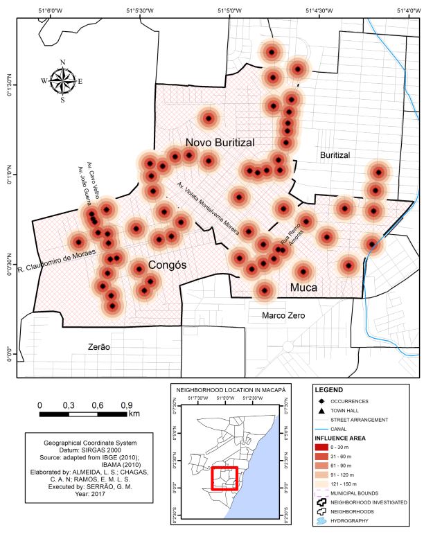 There was a certain difficulty in the research when crossing the database at the neighborhood level with the distribution of the records of the crimes, specifically regarding a consensus of the official sources consulted about which exact area or polygon covers certain neighborhoods in the city of Macapá. Added to this, the lack of standardized and complete records of lethal violent crimes,4 made it impossible to establish the exact location of all criminal events surveyed, leading to the creation of maps showing “hot spots”.