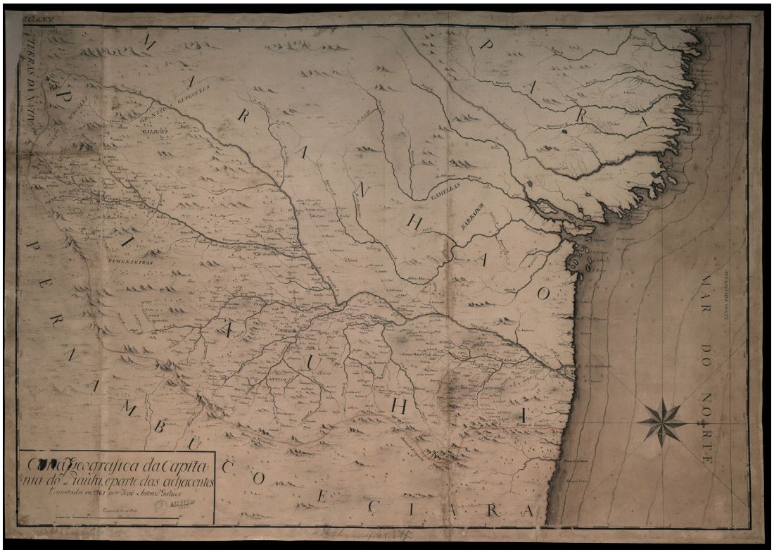 The royal cattle route was one of the most used, mainly by cattle drivers of herds raised in the captaincy of São José do Piauí and in the sertões of Jacobina. Many others were created to boost the social, economic and symbolic exchanges between the sertões and the coast. In 1738, there was the road that linked the village of Recife to the Gerais mines passing by the Ipojuca and São Francisco rivers (IEB/USP-COL.ML, 72.60). Carlos Studart Filho (1937, p. 15-37), a historian from Ceará, narrated the routes and crossways of the roads of Taquara, Camucim-Ibiapaba, the general of the Jaguaribe, nova das Boiadas, das Boiadas, da Caiçara, Crato-Piancó and Crato-Oeiras. In the “General Charter of the Province of Maranhão”, drawn up circa 1820, under the coordination of the military engineer Antônio Bernardino Pereira do Lago, it showed the territory of Maranhão crossed by several routes, linking human settlements with each other and with the territory.