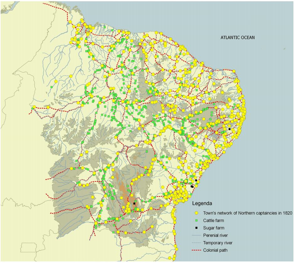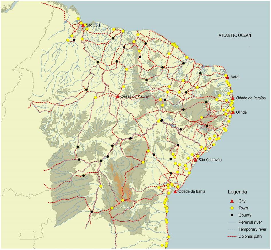 Returning to the geopolitical conjuncture of the late seventeenth century, in 1695, Alencrastro approved the creation of a road that would link the two capitals of the states of Brazil and Maranhão and Grão-Pará (AHU_ACL_CU_MARANHÃO, Cx. 9, D. 906). The Jesuit Jacob Cloceo was commissioned to produce a map and route “for knowledge of the sertão and the land through where the path is discovered (AHU_ACL_CU_MARANHÃO, Cx. 9, D. 906). The route crossed vast areas populated with ranches and farmsteads. Chapels and parishes were built in the vicinity of the road in order to facilitate communication between States, attracting settlers and ascertain the economic potential of the land. In fact, the parish of Nossa Senhora da Vitória (future village of Mocha and town of Oeiras do Piauí), established under royal approval in 1697, guided cotton traders in São Luis for many years. In addition to this parish, the path, later called royal cattle path and way of the cattle herds of Piauí connected different types of settlements along its curves. A traveler would pass through towns (Bahia, Oeiras do Piauí, São Luís), villages (Agua Fria, Jacobina, Vila Nova da Rainha), julgados (Itiúba, Aldeias Altas), parishes (Juitani and Santo Antônio), a religious mission (Juazeiro) and passages (Juazeiro and Santo Antônio).