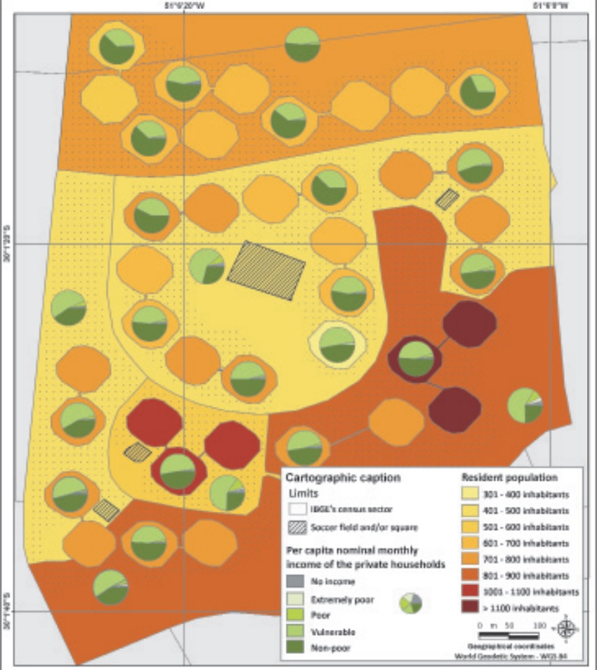 Regarding the socioeconomic conditions of the residents of the complex, using data from IBGE’s 2010 Demographic Census (IBGE, 2011), a map was produced of the resident population and the per capita monthly nominal income of the permanent private households (Figure 4).