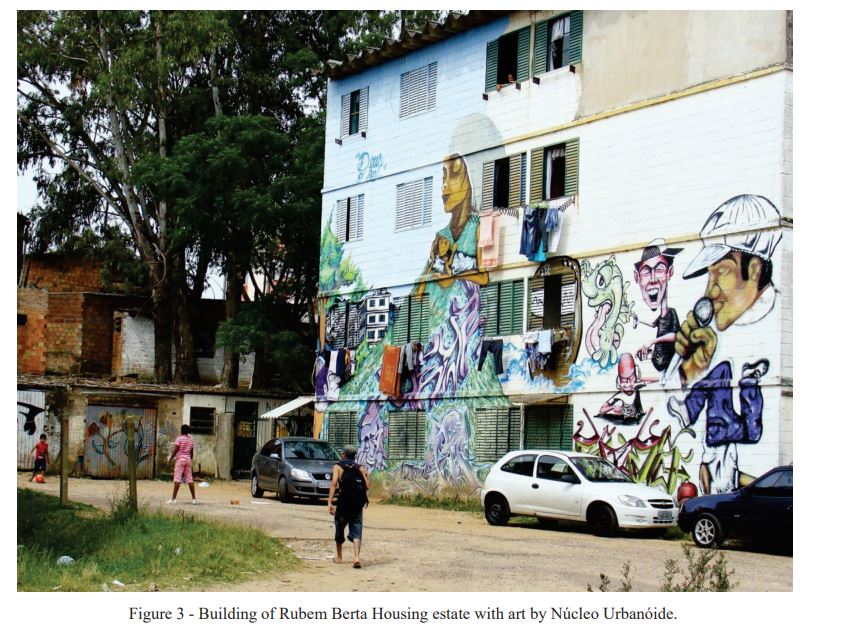 The Cohab is just rap event, which involves many musical groups, is another important movement that happens in the neighborhood and it has great magnitude and importance to young people of the periphery, who experience popular culture. Synchronized with this event is the “Coloring COHAB Project”, which is organized by the Núcleo Urbanóide, in which graffiti artists execute their art on the Rubem Berta Housing Estate’s buildings and houses (Figure 3).