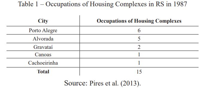 The Rubem Berta Housing Estate was taken over on April 27, 1987, in a context of many occupations of housing complexes in the end of the 1980s, which had been abandoned by the Housing Company of the State of Rio Grande do Sul (Companhia de Habitação do Estado do Rio Grande do Sul – COHAB/RS), in the Metropolitan Region of Porto Alegre (RMPA). Cláudia Pires et al. (2013) highlighted the number of occupations that occurred at that time, as shown in Table 1.