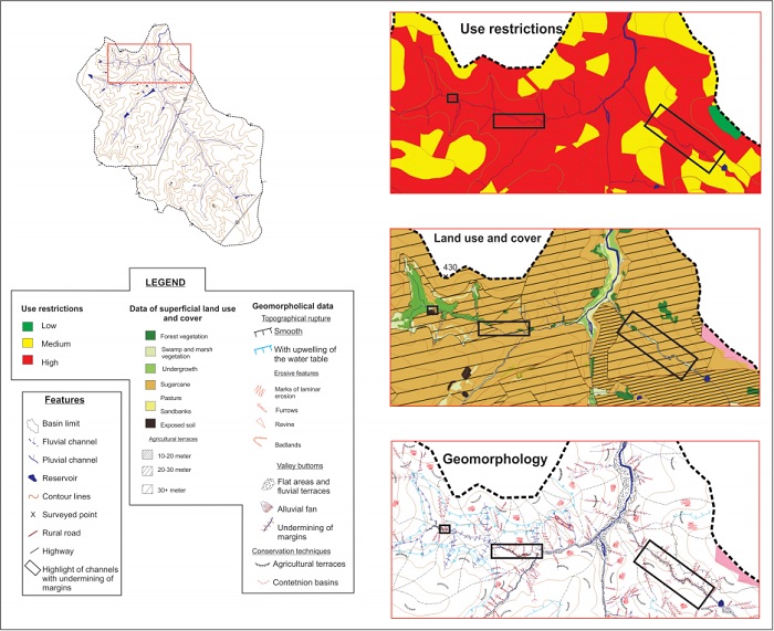 The physical variables were grouped according to the theoretical potential for the formation and development of erosive processes of each thematic class, evaluated in an isolated way and combined with the others, from which the use restriction was defined: low, medium and high. For example, top areas with low relief energy and with Red Alkalis Latosol were considered a low restriction. Tops, convex or rectilinear slopes that had medium to moderately weak energy in an area with Red Alkool or Red Dystrophic Argosol were considered of medium restriction. On the other hand, the terrain found on concave slopes and / or relief energy from strong to very strong and / or with Neosol Litotic or soil subordinated to hydromorphism, independent of the other variables, were considered of high restriction, the protection and preservation of native vegetation being essential. This mapping is in Zanatta, Lupinacci and Boin (2016).