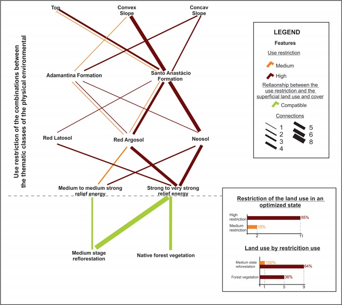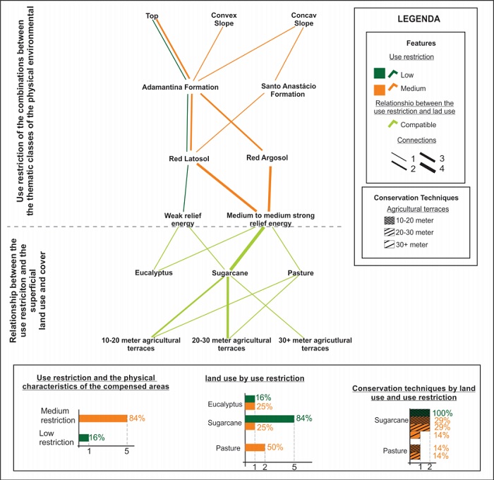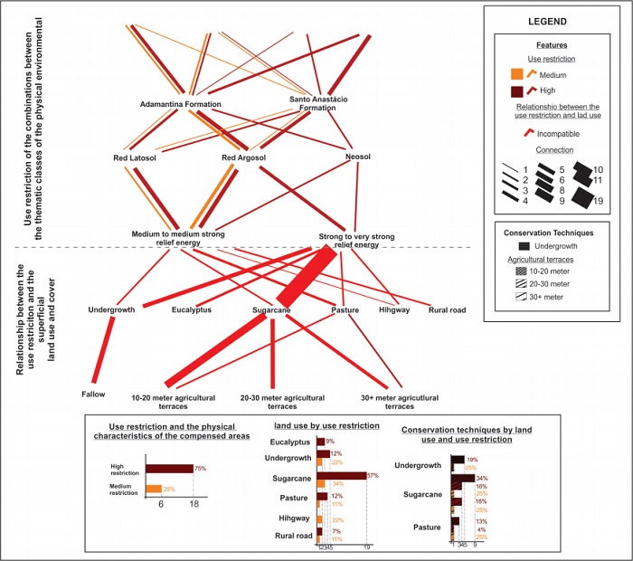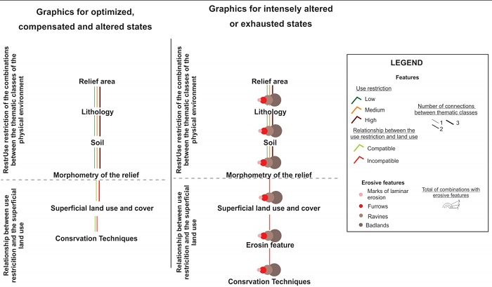 Each graphical scheme represents the grouping of the physical variables found in a given environmental state. In the upper part of this scheme the graph demonstrates the number of combinations of the physical variables that present a certain shape of the relief (top, slope), the litho-logical composition, the pedological and morphometric characteristics (relief energy). From the interaction of these factors, the land use restrictions were established, which are represented in the graphical schemes by the color of the lines (green for low restriction, orange for medium restriction and brown for high restriction) that establish the relationship between the physical variables. At the bottom of the graphical representation, the relationship between the use restriction, land use and conservation techniques was established. This relationship was classified as compatible (lines in green) or incompatible (lines in red), and the thickness of the lines indicates the number of situations with these characteristics. In cases where the environmental state is intensely altered and depleted, a circle representing the erosive form (Figure 1) was added in each thematic class.