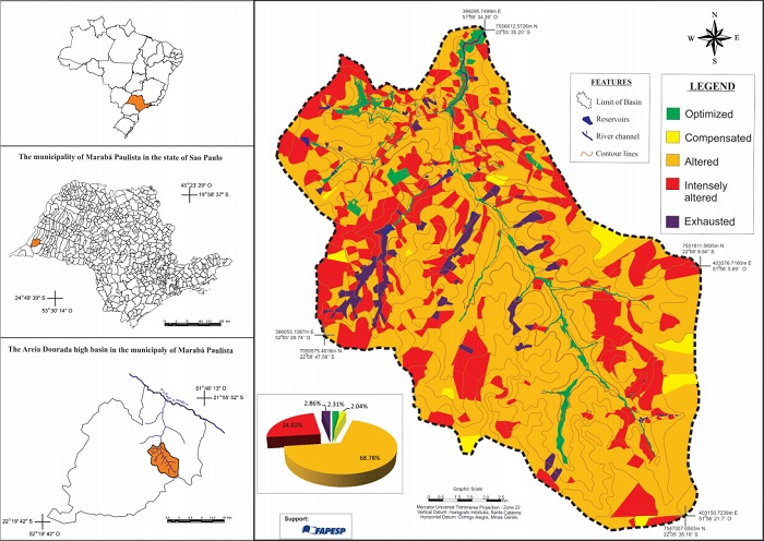 The data show that the contribution of anthropic interference to the Basin’s erosive problem is significant, since only 4.35% of the study area is between the optimized and compensated states, with uses adequate to the physical characteristics, which represents 95.65% in inappropriate uses, of which 2.86% were exhausted, where the original morphology had been modified by the intense erosive activity. It is also worth noting that the problem of these areas in an exhausted state is more worrying when verifying the edge effect of gullying processes, that result in headward erosion by the appearance of ravines on the sides in higher sectors. Such situations still have a significant impact on the valley bottoms, and consequently on the water quality of the Basin, either by undermining the banks in the tributaries, or by the silting of the main channels.