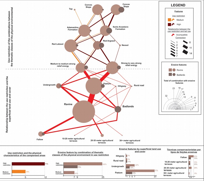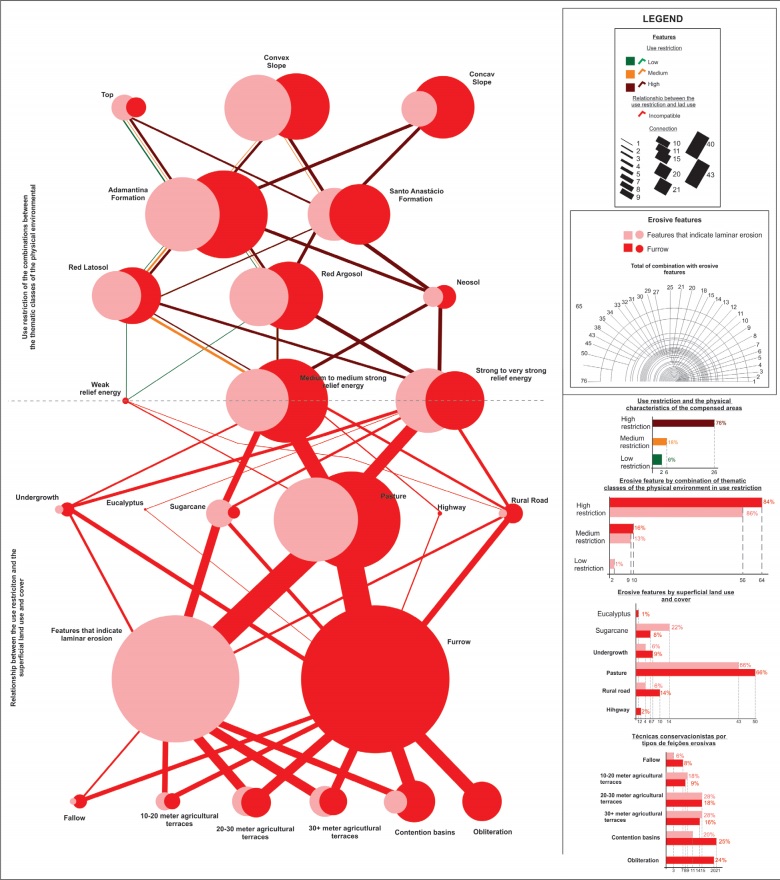 The use of network graphs, associated with cartographic spatialization in the analysis of the Basin’s problem, was relevant in the quantification and evaluation of the combinations of physical and anthropic elements that result in different classes of environmental status. This representation facilitated the interpretation of the erosive problem of the Basin and the elaboration of the environmental diagnosis by synthesizing a large volume of information and, through the links between these elements, indicates the catalysts of erosive processes, allowing the elements driving the system to be verified.