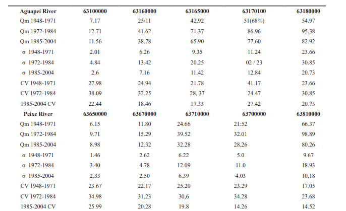 The analysis of the graph results indicates three clearer hydrologic periods (ROCHA & ANDRADE, 2012). The first is characterized by lower magnitudes of the flow and a lower interannual variability. They have smaller values for the magnitude of the flow, standard deviation and coefficient of variation than the values of the complete data series.