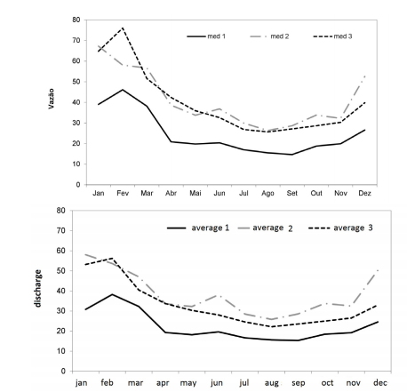 In order to understand the interannual flow variability, the annual averages of the hydrological series of the stations available for these basins were used, which had been previously studied by Rocha & Andrade (2012, 2015). The stations’ interannual data were tabulated in spreadsheets and graphs of the historical series were elaborated, using a station in each basin, with the longest series of historical data. The identification of the periods was done from the visual analysis and then by a comparative statistical test of the means, standard deviation and coefficient of variation for validation.