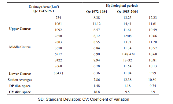 In terms of average variation by sector, the largest variations of Qe values were observed in the stations of the lower course, between the first and second and between the second and third hydrological periods.