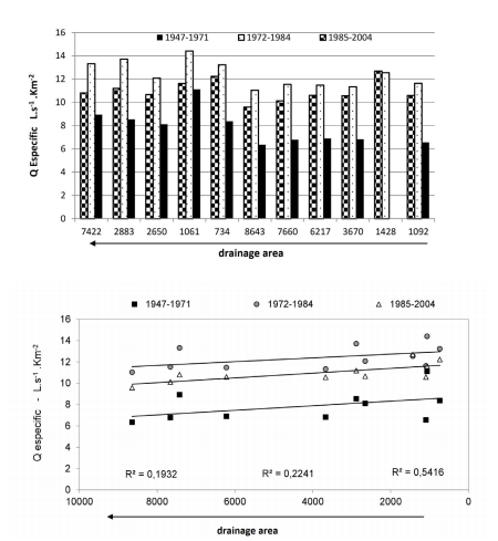 The results reveal changes in the spatial patterns of Qe. The stations located in the upper courses of the basins had more variable data in the three hydrological periods, which was expected. As for the temporal patterns, the first period had a greater variability in the values between the high, middle and lower courses. There was a gradual increase in the homogeneity of the values between the basin stations, as the hydrological periods happened.