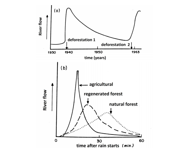 In general, the greatest impacts are associated with the relation between infiltration-flow, due to interference in vegetation, soil and river flows (ROCHA & ANDRADE, 2012). In the short term, the loss of tree cover reduces the loss of soil water by transpiration, as the deep roots of the trees are cut off, as well as causing more water flow on the surface of the land, since the old vegetation and the cushioning blanket of fallen leaves are replaced by bare soil or by crops with lower storage potential. Thus, the likelihood of the direct flow of water to the rivers is increased. Figure 1 illustrates the effect of deforestation on the river flow of small river basins (DREW, 1994).