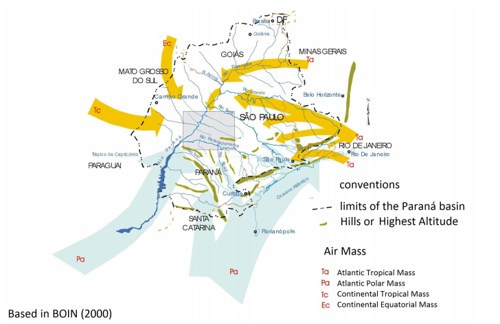 The regional climate is influenced by air masses, such as Atlantic Tropical (Ta), Tropical Continental (Tc) and Continental Equatorial (Ec), alternating between a period with higher temperatures and high rainfall (from October to March) and another with mild temperatures and lower rainfall indexes (April to September) (SOUZA, 2005), as shown in Figure 3.