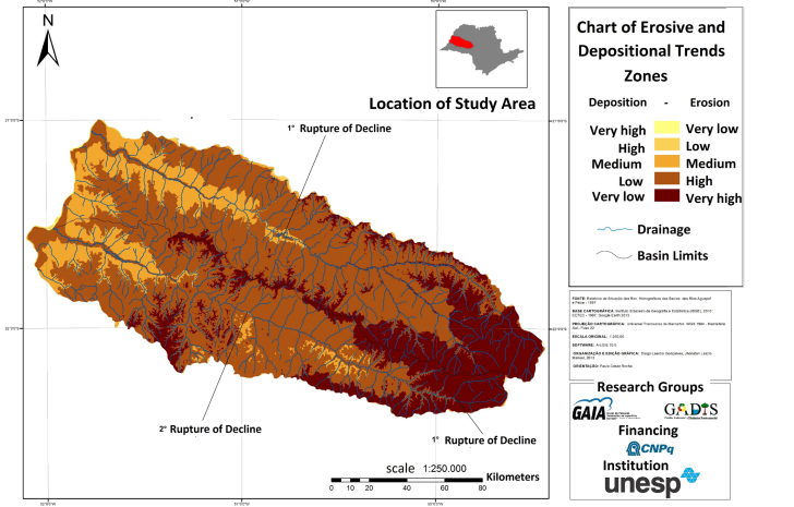 Due to sandy soil characteristics, associated with inappropriate land use, according to the Synthesis Book of the Hydrographic Basins of the Aguapeí and Peixe Rivers (CBH-AP, 2011), 70% of the basin areas have a high degree of potential soil erosion. Figure 6 presents a study on erosive and depositional trends for the two water resources’ management units.