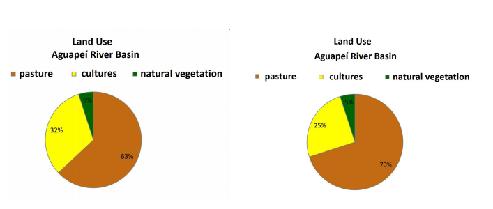 In general, the land use of both basins is dominated by pastures, with an intense advance of sugarcane as a temporary crop. The graphs in Figure 7 show the division of activities in the rural area, based on CBH-AP reports.