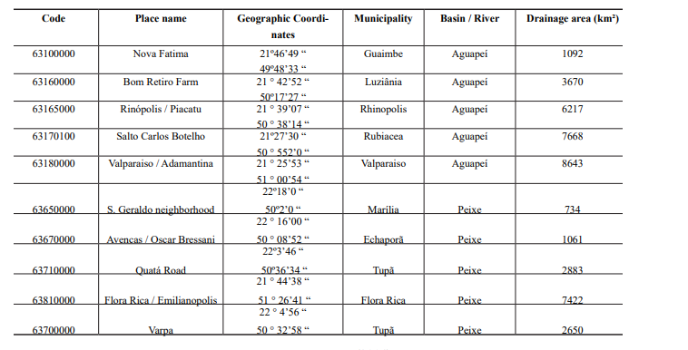 It is important to remember that the two hydrographic units (Aguapeí and Peixe) are composed of drainage channels that run through lands of the same geological - the sandstones of the Bauru Group (IPT, 1981), and geomorphological domain – the western plateau of São Paulo (ROSS & MOROZ, 1997). They also belong to the same climatic region - alternately dry and humid tropical climate (MONTEIRO, 1973), which facilitates the correlation between the data of the stations.