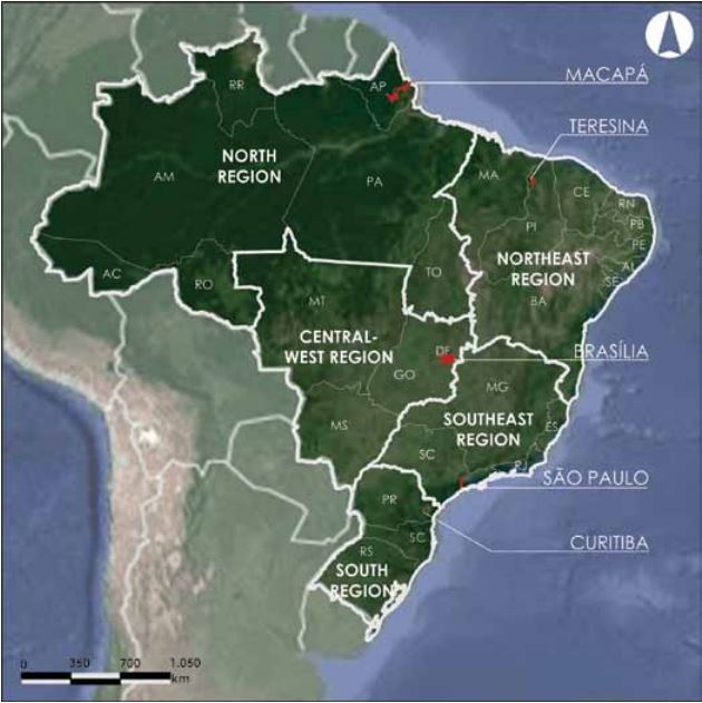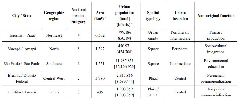 The research structure was based on exploratory, descriptive and analytical methods, starting with the interpretation of empirical experiments, with a selection of five examples in capitals of Brazilian states, chosen for their representativeness in the national urban network, in different geographic regions, and for their varied socioenvironmental standards and historical-cultural aspects. Three typologies of urbanized areas - central, intermediate and peripheral - were also considered, associated with different economic conditions and with distinct non-original functions in the spaces in question (Figure 1 and Table 1).