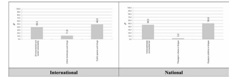 In the Brazilian scenario, the same terms were searched for in the Portal of Periodicals of the Coordination of Improvement of Higher Education Personnel (CAPES, 2013), which since 2000 has made a relevant part of the country’s scientific production available, thus the same time cut was adopted. Only 63 articles were found for this period, a significantly lower proportion (32.8%) than the foreign situation (Oliveira and Pellizzari, 2014). The synopsis of the main bibliometric results is shown in Figure 2, where it is possible to note the significant concern with social and environmental vulnerability (39.3% and 46.0% of international and national texts, respectively) and the expressive relationship between urban public spaces and drugs (48.9% and 50.8% of foreign and Brazilian articles, in that order).