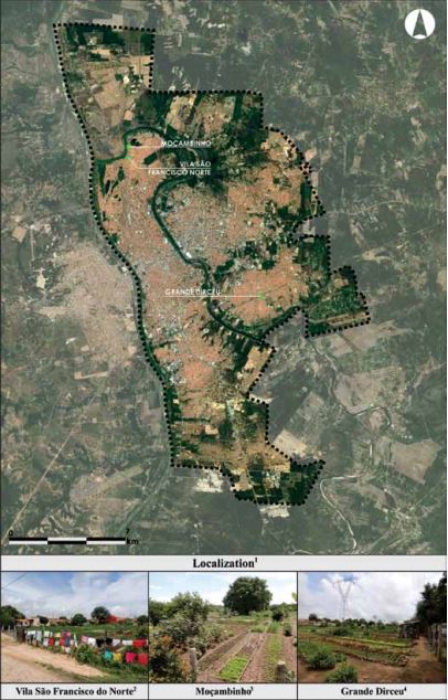 In the same region, there are other examples of community vegetable gardens, among which the Moçambinho also received a technical visit (Figure 3 - central view). One of its essential features is that it is composed of land on the banks of the Poti River, located in the great floodplain (close to the areas of permanent conservation), whose soil, due to the fluvial influence, is naturally fertile (SMDR, 2017); these plots are spatial remains wedged between the access road and the waterway.
