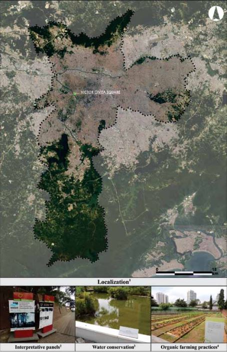 With an innovative character, the square has a stage and bleachers for 290 people, as well as the building of the old Pinheiros incinerator, recovered to host exhibitions and events. Interpretative panels (Figure 5 - left view) allow different locations and equipment to be identified, with an emphasis on those aimed at the dissemination of water conservation processes and the development of organic farming practices (Figure 5 - central and right views, respectively), among others.