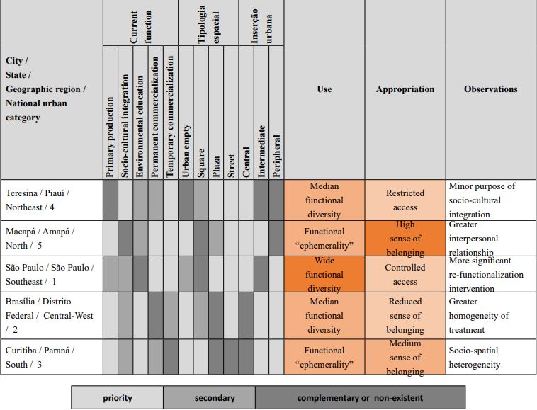 As a result of the selection criteria adopted, the functional diversity of the analyzed experiences (association of primary production, socio-cultural integration, environmental education, permanent commercialization or temporary commercialization) is verified under different spatial typologies (empty, square, plaza and street) in differentiated positions in the urbanized network (central, intermediate and peripheral). As expected, all the examples have multifunctional characteristics of use, with emphasis on the Victor Civita Square (Open Space of Sustainability, São Paulo, São Paulo, Southeast Region), which is inserted in the largest metropolis (RIBEIRO et al., 2009), including its wide range of urbanistic functions, which leads to the hierarchy of places as stated by Santos (2008). In compensation, Alves et al. (2010) also indicate the increase of situations of vulnerability in their intra-urban scale, with the probable omission of certain groups (CRAWFORD; BELL, 2012).
