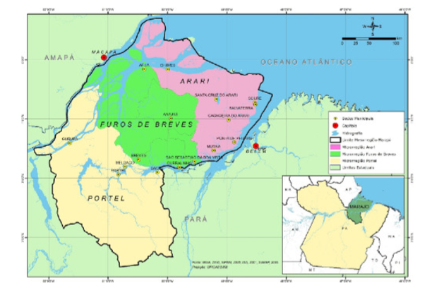 The Marajó region has a strategic geopolitical position at the mouth of the Amazon River and is also bathed by the Atlantic Ocean, which gives it an estuarine appearance (IPEA, 2015). The territorial extension of the Marajó is approximately 104,140 km², with a population estimated at 548,634 inhabitants (in 2017), with Breves and Portel being the only municipalities with more than 50,000 inhabitants (99,896 and 60,322 inhabitants, respectively) (IBGE, 2017). Due to the regionalization created by the IBGE in 1989, the Marajó is considered a mesoregion and is subdivided into three geographic microregions: Portel, Furos de Breves and Arari (Figure 01).