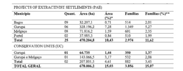 The Portel microregion consists of the municipalities of Bagre, Gurupá, Melgaço and Portel, with a population of 149,485 inhabitants and 43.3% (4,509,641.2 hectares) of the territorial extension of Marajó (IBGE, 2017), occupying the largest portion of this Meso-region. The Portel microregion contains the RUP Itatupã-Baquiá (Gurupá Municipality), RESUR Gurupá-Melgaço (Melgaço and Gurupá), as well as FLONA Caxiuanã. Regarding the PAEs, the Portel micro-region has an area of 470.2 thousand hectares, distributed in 25 Projects. Thus, the National Agrarian Reform Policy occupies 15.3% of the territorial extension of this Microregion (678 thousand hectares) and 15.07% of the families (3,856) recognized in Marajó (Table 02).