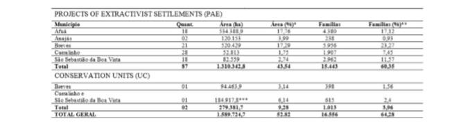Authors such as Fernandes (2015) criticize this type of agrarian reform, calling it "conservative", because even though the areas and families included in national agrarian policy are significant, it has not been able to change land concentration in Brazil. However, even if this policy does not change the problem of land concentration, its importance is undoubtable, since the legal recognition of these areas is a debt that the State owes to the populations that historically occupy the Brazilian territories, in particular, spaces such as the Marajoara, marked on the one hand by the latifundia, and, on the other, by an huge population that was on the margins of public policies, especially the agricultural ones, since their territories were not legally recognized. This subject is dealt with in the subitems below.