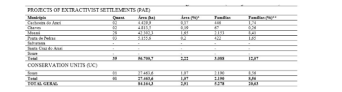 The numbers of the II PNRA in this Microregion indicate the best performances among the three Marajó microregions. The proportion of 52.82% (about 1.6 million hectares) of the territory of Furos de Breves is already inserted in this policy, and 64.31% (16,456) of families have already been recognized throughout Marajó. There are already 87 PAEs in Furos de Breves, in an area of 1.31 million hectares and 15,443 families have been registered in this modality of land regularization alone (Table 03).