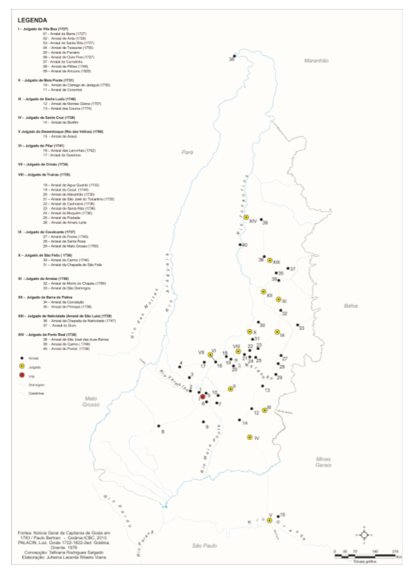 In the first instance, the research methodology is based on a bibliographical survey on the historical geographic formation of Goiás; the classic contributions of Palacin (1976), Salles (1992),Palacin et al. (1995) and Bertran (1978, 2010) are noteworthy as their research is based on primary documentary sources. After this, the focus was on documentary research using the databasesof the Historical Geographical Institute of Goiás (IHGG), and the Ultramarinho Historical Archive of Lisbon (AHU). The documents analyzed are fiscal reports of the local colonial administration, which, although limitedin terms of the methodology of the data collection, definitions of terms and time gaps, provided important records about the julgados (jurisdictions ) in Goiás, allowing the delineation of hypotheses about the dynamics of mercantile activity carried outin the period.
