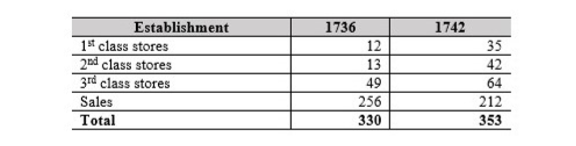 It is important to note that, though Bertran (2010) registers the increase in the absolute number of establishments, relative to the population, there was a decrease. The average number of inhabitants per establishment, which was 43:1 in 1736, rose in 1783 to 116:1.