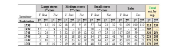 Even with the conceptual limitation of the documents, it is possible to measure at least the minimum amount of commercial establishments existing at the time, as shown in Table 2, which displays the numberof these establishments of the Intendencies of Vila Boa and Tocantins, which left the Capitação during the first and second registrations between 1738 and 1751.