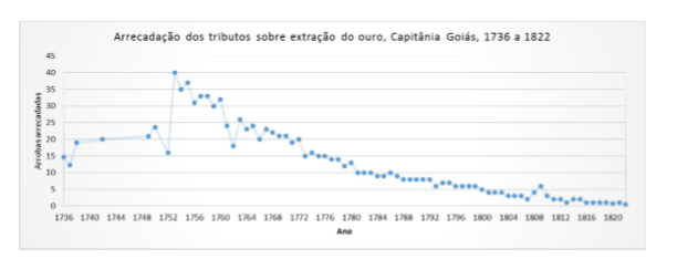 Figure 2, shows that from 1753, the year in which the collection of tributes on the exploration of the gold reached its highest point, 40 arrobas, there was a downward trend in the fiscal revenues from mining.