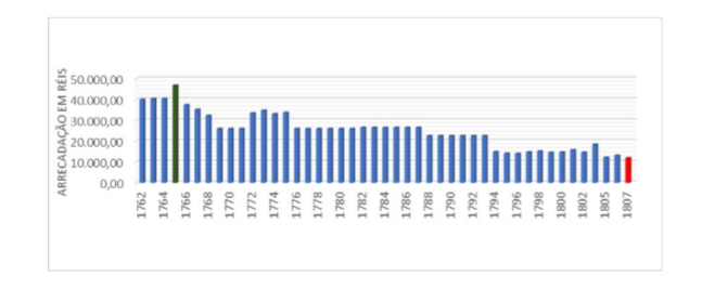 Figure 3, which demonstrates the decrease in tax collection, suggests that from the 1780s, trade in imported goods in the captaincy declined considerably.