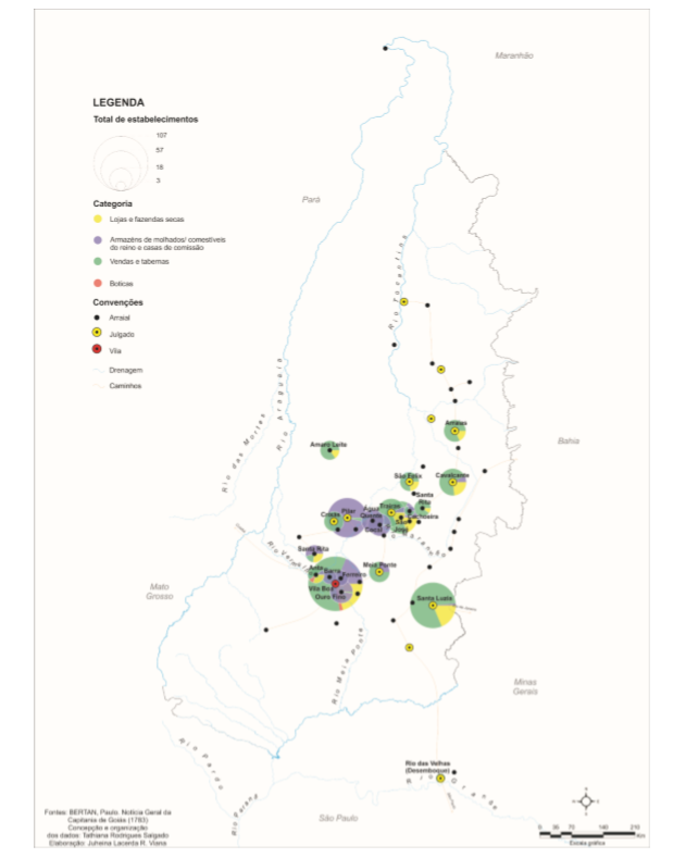 Figure 4 also verifies the privileged situation of the capital Vila Boa concerning commerce, due to its administrative function, and of the Arraiais of Meia Ponte and Santa Luzia, which were located at the path junctions, which facilitated the reception of marketable goods.