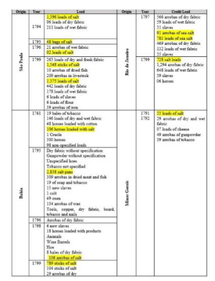 Gumiero (1991), gathers data from the examination of documents from the Archive of the Bandeiras Museum, in the City of Goiás, recording that the main products entering the Captaincy of Goiásbetween 1761 and 1799 were: sea salt, fresh and dry goods, cheese, gunpowder, lead, tobacco, cotton, slaves, spades, wine, dried meats and fish, soap, horses, oxen, wax, hardware, copper, nails, flour and iron. The authoralso indicates that Goiás’ leading suppliers were São Paulo, Bahia, Rio de Janeiro, and Minas Gerais.