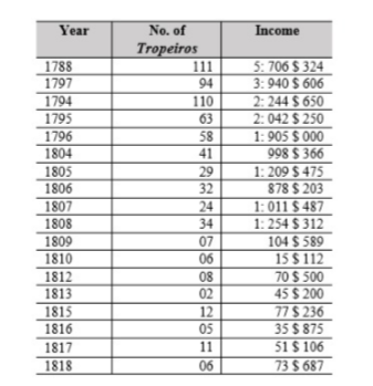 With the decrease of mining activities, there was also a reduction in the movement of tropeiros. Table 3 gives an example of the reduction in the number of tropeiros who passed through the count at São João das Três Barras between 1788 and 1818.