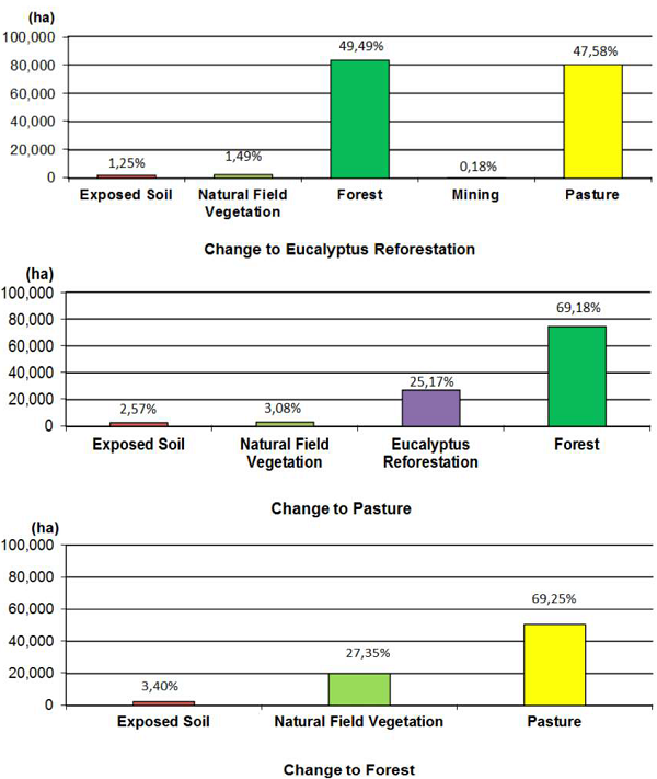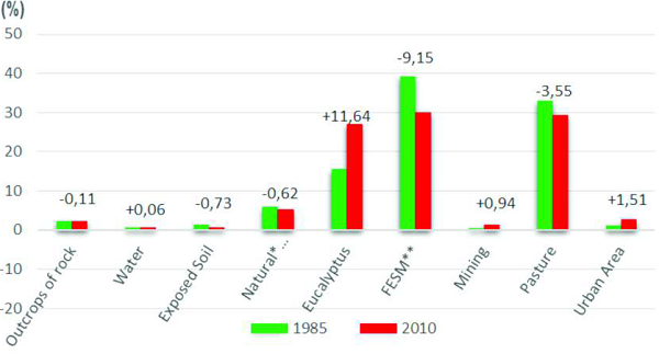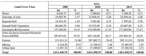 The land cover mapping results indicate that the cover changes in the study area occur mainly in the Eucalyptus Reforestation, Pasture, and Semi-deciduous Seasonal Mountain Forest classes. Between 1985and 2010, there was a decrease in the Pasture and Semi-deciduous Seasonal Mountain Forest areas, and a rise in the Eucalyptus Reforestation areas. The Eucalyptus Reforestation area grew the most during this 25-year period.The expansion in the area of this category is strongly linked to the installation and expansion of the steel, paper and cellulose industries.