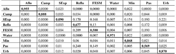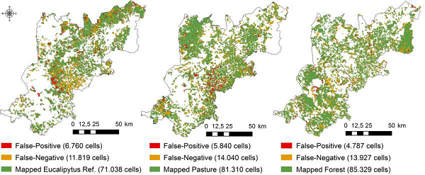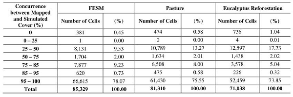 As shown above, for Eucalyptus Reforestation, out of a total of 71,038 cells (0,25 x 0,25 km,6,780 (9.51%) are false-positive and 11,819 (16.63%) false-negative. The Pasture category has a total of81,310 cells (0.25 x 0.25 km), 5,840 (~7%) are false-positive and 14,040 (17%) are false-negative. TheFESM group has a total of 85,329 cells (0.25 x 0.25 km), 4,787 (6%) are false-positive inclusionmistakes and 13,927 (16%) are false-negative. As the analysis encompasses neighboring pixels, a 0.25 x0.25 km cell may have different hit percentages for mapped and simulated land covers. Therefore, it ispossible to classify each cell in different concurrence intervals, as shown in Table 5.