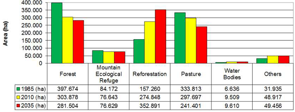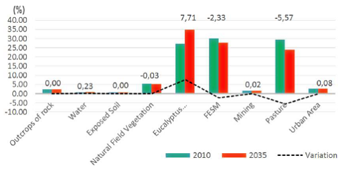 The land cover simulation for 2035 assumed that eucalyptus demand will continue to rise at the same rates as those observed between 1985 and 2010. This simulation points to a scenario where Forest, Pasture,and Eucalyptus Reforestation will still be the most representative land cover classes. However, by 2035, according to the model’s assumptions, the most representative cover is expected to be Eucalyptus Reforestationrather than Forest and Pasture.