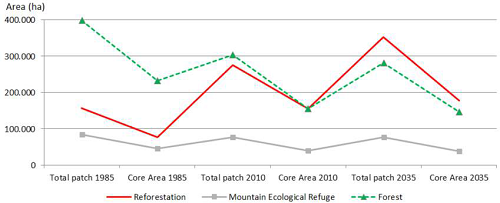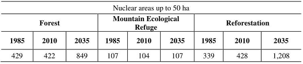 From these results, the classes which best represent and prioritize conservation in the study area(Forest, Reforestation and Mountain Ecological Refuge) were evaluated both by the number of patches,number of nuclear areas and the level of isolation of the patches.